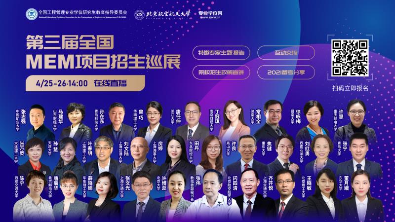 第三届全国MEM招生巡展是由全国工程管理专业学位研究生教育指导委员会和北京航空航天大学主办,专业学位网协办的一次MEM院校招生政策“云”宣讲活动,本次活动共有来自天津大学、浙江大学、大连理工大学、北京航空航天大学、上海交通大学等30多所院校参加,14位院校负责人做了招生宣讲报告,其中来自山东的青岛大学、青岛科技大学、山东财经大学和济南大学同台宣讲,线上参加人数近两万余人。