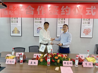 与连起餐饮管理有限公司举行了济南大学毕业生就业实习基地签约挂牌仪式。连起餐饮管理有限公司总经理韩昌明、执行副总孟凯、招商总监李浩、真人棋牌