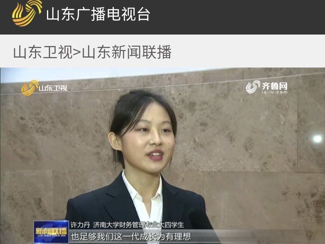 我院许力丹同学作为学生代表在会议结束后接受了山东广播电视台的采访,镜头前,她激动地表达了个人感受,这次宝贵的参与机会让她感到倍感振奋、深受鼓舞、信心倍增,尤其是对报告会中所强调的新发展阶段、新发展理念、新发展格局的丰富内涵和核心要义有了更深层次的理解。她认为,从十四五到2035不仅是国家发展的重要战略机遇期,也是我们这一代青年学子应该砥砺奋斗的黄金时光,我们应擦亮青春底色、肩承拼搏使命,努力成长为有理想、有本领、有担当的时代新人,将个人的理想追求与国家的发展、社会的进步、人民的需要紧密结合,以小我融入大我、用自转推动公转,为实现中华民族伟大复兴的中国梦贡献我们的青春力量。