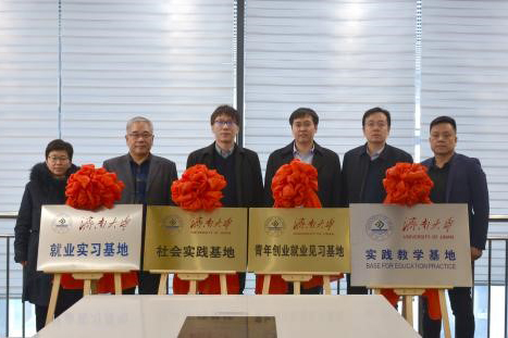 在签约仪式上,柳兴国副院长、张奉军组织员、王悦副院长分别与刘豪总经理、李岩溪运营总监,李艳霞副总经理代表双方签署了两个战略合作框架协议及济南大学本科实践教学基地、济南大学毕业生就业实习基地、共青团学生社会实践基地、共青团青年就业创业见习基地”四个协议,并和马谦副区长、高扬主任,刘延飞董事长、刘豪总经理共同为基地揭牌。