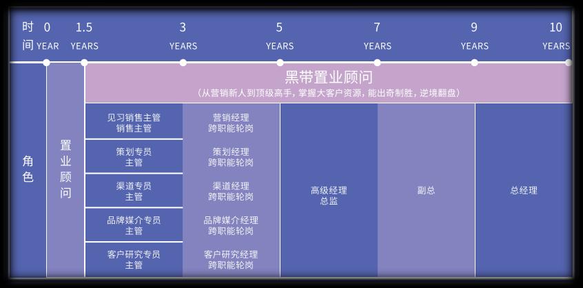 注:绽放生的初始岗位为置业顾问,你们需要在这个岗位上深刻了解客户、市场、竞争、行业特征以及营销这个职能。在初期的几年内,你们多数将在销售及销售管理方向发展,过程中也可转岗策划推广、渠道管理、客户及市场研究、品牌管理等方向发展,当然也有机会跨职能、跨航道发展。