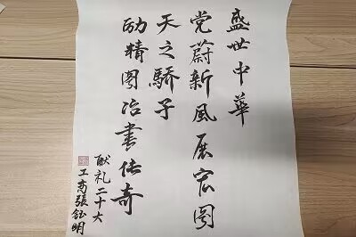 莘莘学子的昂扬热情。活动作品题材丰富,内容积极,形式多样,异彩纷呈,具有很强的艺术感染力。志愿者们将优秀作品进行展览,路过的同学无不驻足欣赏。其中有一幅书法作品最引人注目,作者以笔力遒劲,惊若翩鸿的字迹,写下了对党和国家的赞美与祝福,表达了青年人报效祖国的伟大抱负。