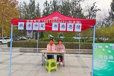 青年志愿者协会在经管楼前举办了“执手中笔,书感恩情”活动。