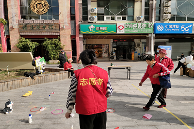 青年志愿者积极配合,耐心地为社区的老人们讲解并演示运动项目,在志愿者的帮助下,老人们感受到了套圈、丢绣球等游戏的无限乐趣,大家相互鼓励,交流经验,玩出了“年轻态”和“精气神”,仿若找回了童年时代的美好时光。旁观者有给参赛者加油打气的,有传授自己心得的,有为参赛者鼓掌助威的……这一刻,他们尽情享受着游戏的快乐。赛场上笑声不断,掌声迭起,全场充满了热烈、欢乐、祥和的气氛。