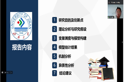 12名参赛选手通过PPT汇报展示自己目前的研究成果,从文献综述、学术创新、理论分析、实证分析和研究结果等多方面展开,既有对前沿问题的聚焦,也有实证方法的分享。现场评委老师从整体研究框架的完整性、创新点的探索、PPT制作以及表达能力等方面对每位参赛选手进行了逐一点评,既肯定了选手们的突出表现,耐心指出其不足,并提出建设性意见,使每位同学受益匪浅。