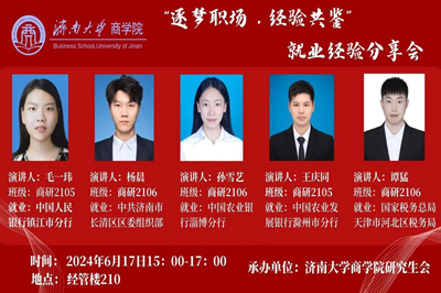 团委主办,研究生会承办的“逐梦职场·经验共鉴”就业经验分享会于6月17日在经管楼210举行。本次分享会邀请到毛一玮、杨晨、孙雪艺、王庆同及谭猛五位优秀硕士毕业生,从选岗、简历投递、笔试面试技巧和求职心态等多方面进行经验分享。