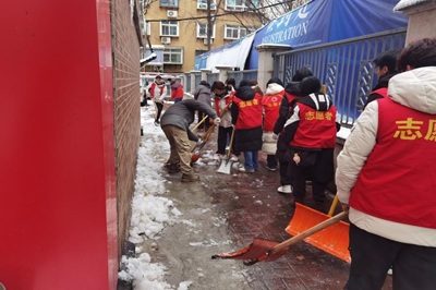 青年志愿者协会的"红马甲"们已踏着积雪走进舜园社区,在社区为居民开辟出安全通道,展现出百万大学生积极投身社会实践的担当风采。