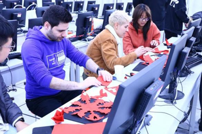 在初步了解剪纸文化后,大家迫不及待地拿起剪刀与彩纸,开始动手尝试。起初手法虽显生疏,但在观看教程视频和互相学习的过程中,同学们和外教逐渐掌握了折叠与剪裁的技巧。不一会儿,一幅幅精美的剪纸作品陆续诞生——有传统的龙、凤、花卉,也有融合现代元素的创意设计,展现出青年一代对传统文化的创新理解。外教老师对同学们的创意与进步赞不绝口,并鼓励大家继续传承与发扬这项非物质文化遗产。