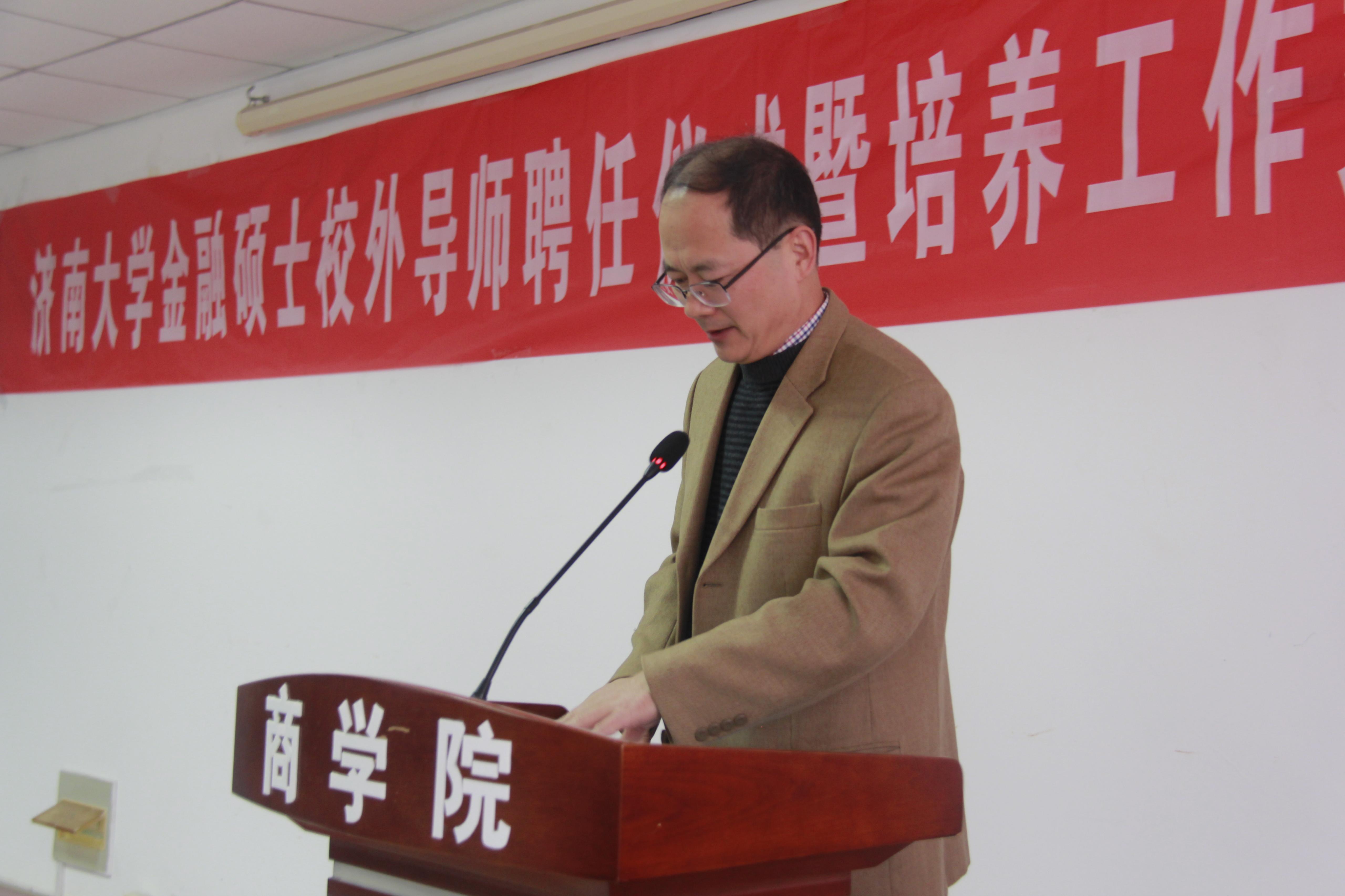孙国新院长介绍了我校研究生工作近年来取得的成绩,指出校外导师在专业学位研究生教育中的重要性,并对与会各位校外导师的积极参与表示衷心感谢。冯素玲院长围绕现代经济对金融高层次人才的需求,指出金融专业学位研究生的人才培养需要以学生实践能力提高为目标,加强校内、校外导师合作,将理论与实践应用相结合。刘毅副院长宣读了校外导师聘任名单,济南农村商业银行历下支行刘伟杰行长、金融专硕研究生许德慧分别作为校外导师代表和研究生代表发言,国家金融教指委办公室主任刘庭竹研究员作了“金融专硕教育与校内外联合培养”的主题报告。