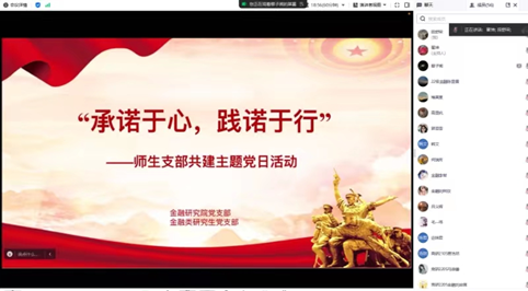 2023年12月9日,金融研究院党支部与金融类研究生党支部联合开展“承诺于心,践诺于行”支部共建主题党日活动。本次会议由金融研究院党支部书记翟坤主持,金融研究院党支部全体教师党员及金融类研究生党支部全体学生参加了本次活动。