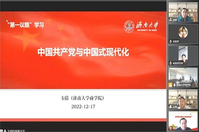 首先进行“第一议题”学习,院长韦倩以《中国共产党与中国式现代化》为题,结合二十大精神学习从 二十大报告关于中国式现代化的论述、现代化理论的未解之谜与基于合作视角的探索、中国传统文化与中国的四次工业革命之路、中国共产党与社会困境化解和中国困境化解的中国方案五个方面进行了深入阐释。