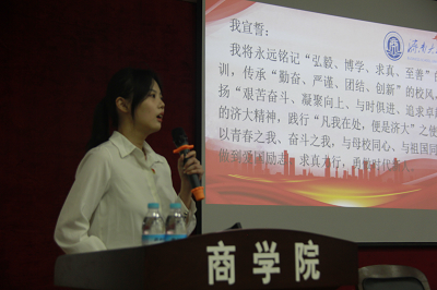 活动中,财会类学生第一党支部书记陈妍洁宣读《2023届毕业生党员文明离校倡议书》,倡议毕业生党员善始善终、牢记师恩,在离校的过程中充分发挥党员模范先锋作用,践行初心使命、积极担当作为,使党员这张名片更加绽放光芒。学生代表财会类学生第一党支部董一磊发言,表达了对学校与老师的感恩之情,以及努力学习、扎实工作和实干争先的信心与决心。经贸类学生党支部书记蔡明洋带领全体党员重温入党誓词、重忆入党经历、重问入党初心,将初心融进灵魂,把使命扛在肩上。金融类学生第二党支部书记范葳蕤带领全体党员集体宣誓,始终铭记“弘毅、博学、求真、至善”的校训,坚持传承“勤奋、严谨、团结、创新”的校风,努力发扬“艰苦奋斗、凝心聚力、追求卓越”的济大精神。毕业生党员纷纷表示,将自觉承担起传承济大精神的责任与担当,把忠诚书写在党和人民事业中,把青春播撒在建设祖国的征程上,把光荣镌刻在历史行进的史册里。